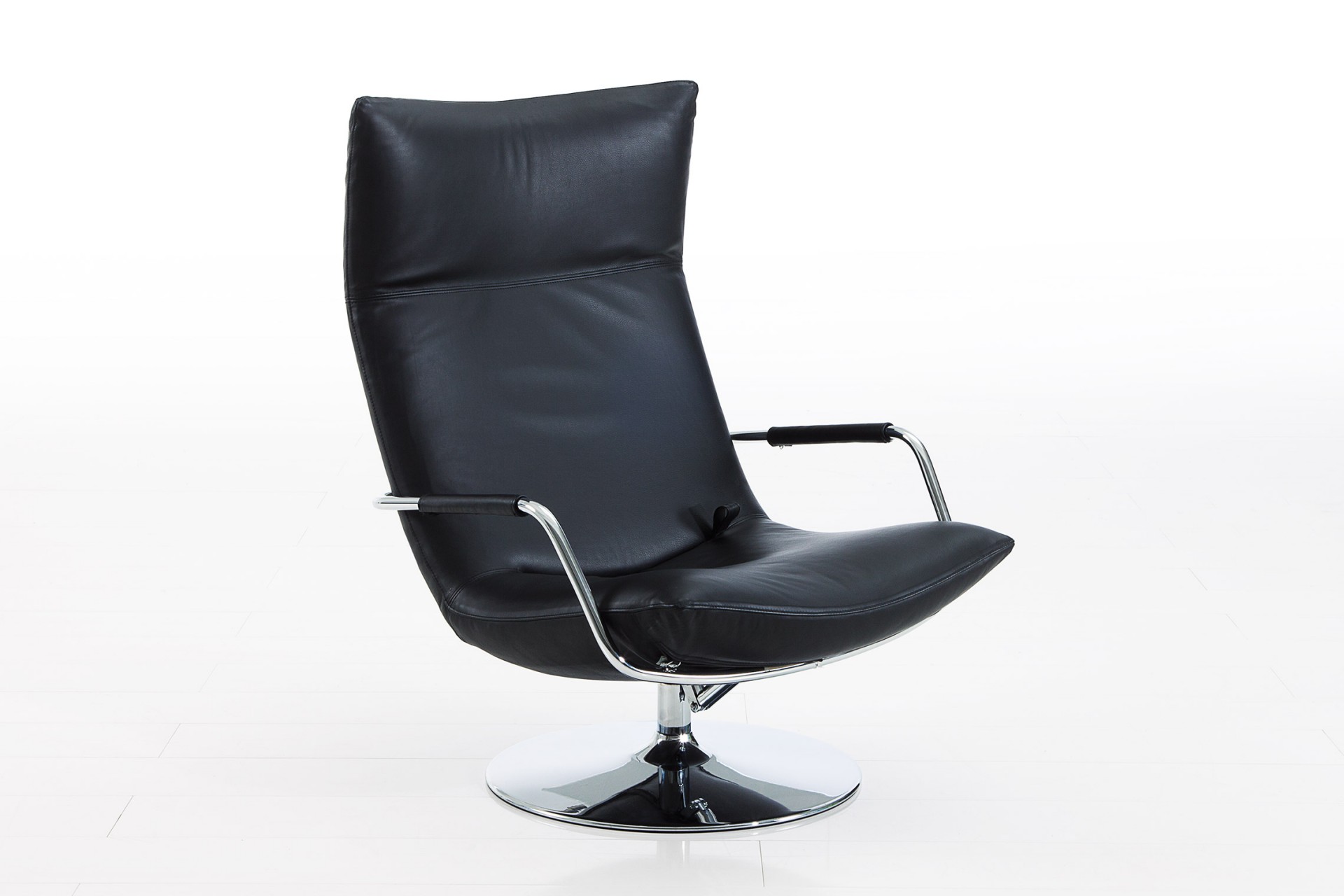 Der puristische Hochlehnsessel gerard, hier in der Ausführung high, lädt zum Verweilen ein. Die elegante Form wird durch geschwungene Armlehnen und einen drehbaren Chromtellerfuß betont. Hochwertiger Bezug aus offenporigem Leder oder Textil.