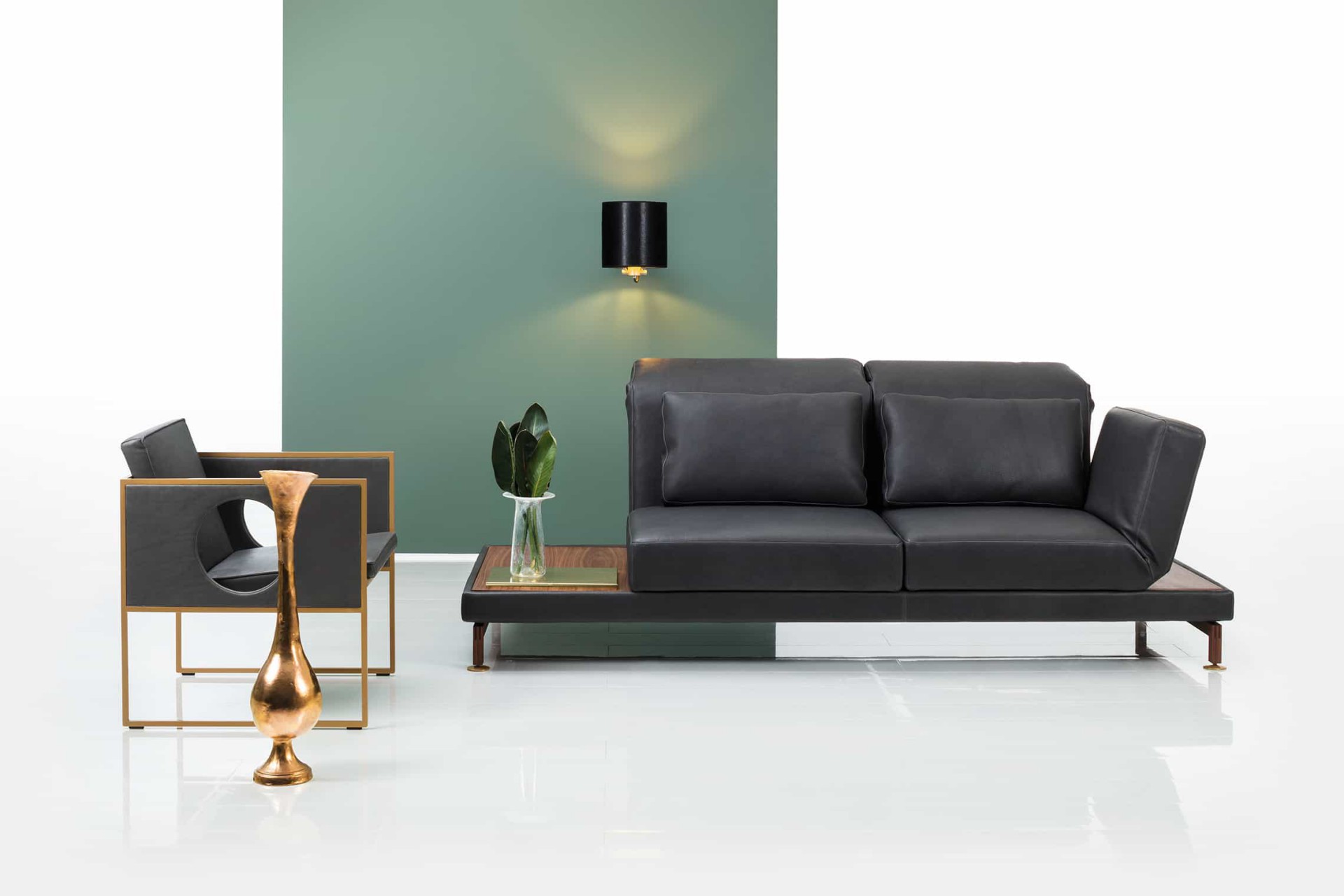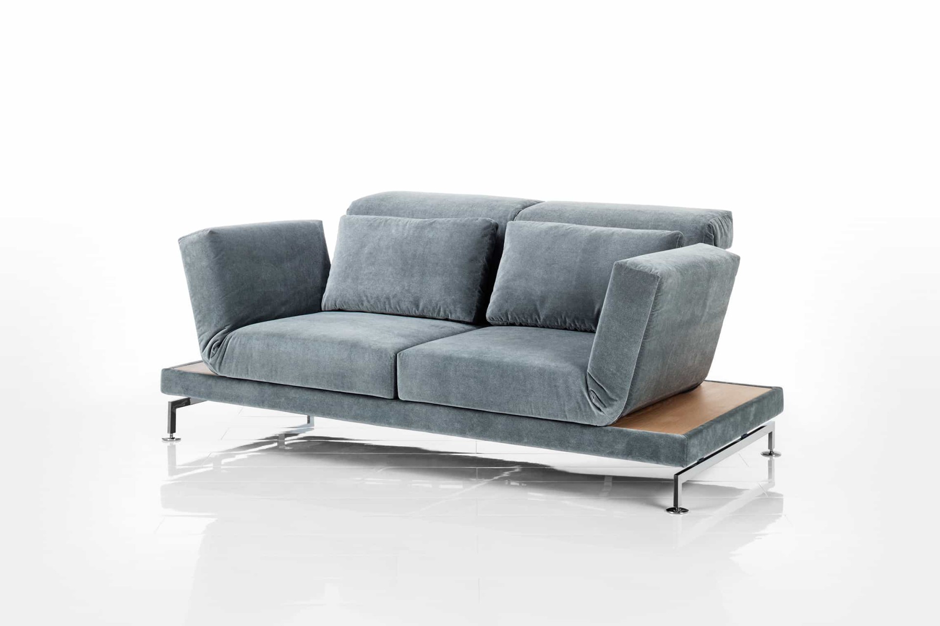Zahlreiche Ausstattungsdetails lassen sich individuell konfigurieren: eine individuell von 42 bis 44 cm einstellbare Sitzhöhe, Kufen in Metall oder Massivholz, optional auch mit Rollen hinten. Für den erhöhten Komfort in der Loungeposition befinden sich beim Sofa wahlweise an den Seiten zusätzliche Tischeinlagen. Dank der abziehbaren Bezüge kann das Erscheinungsbild kreativ verändert werden, dabei ist auch ein Wechsel von Textil zu Leder möglich.