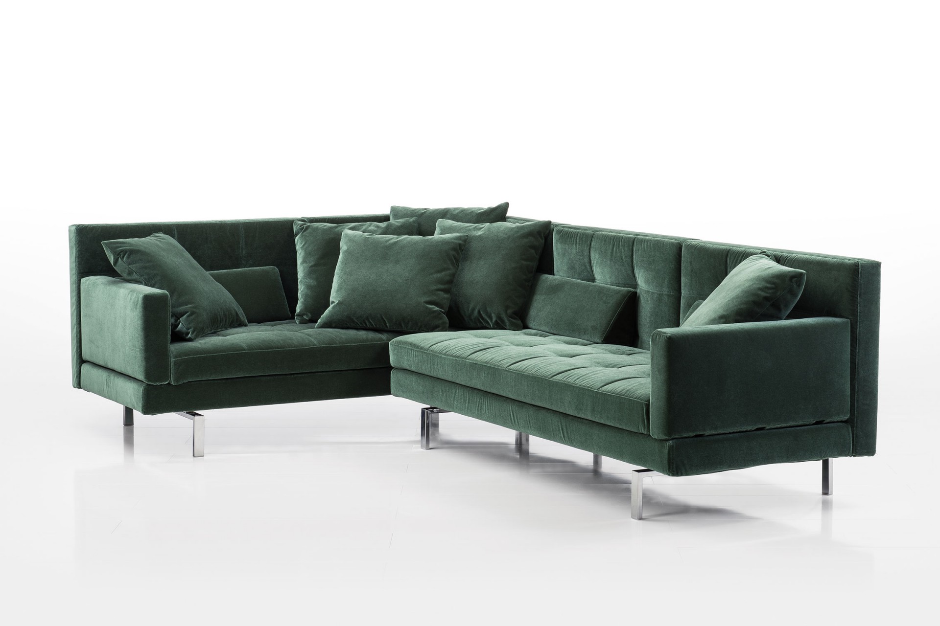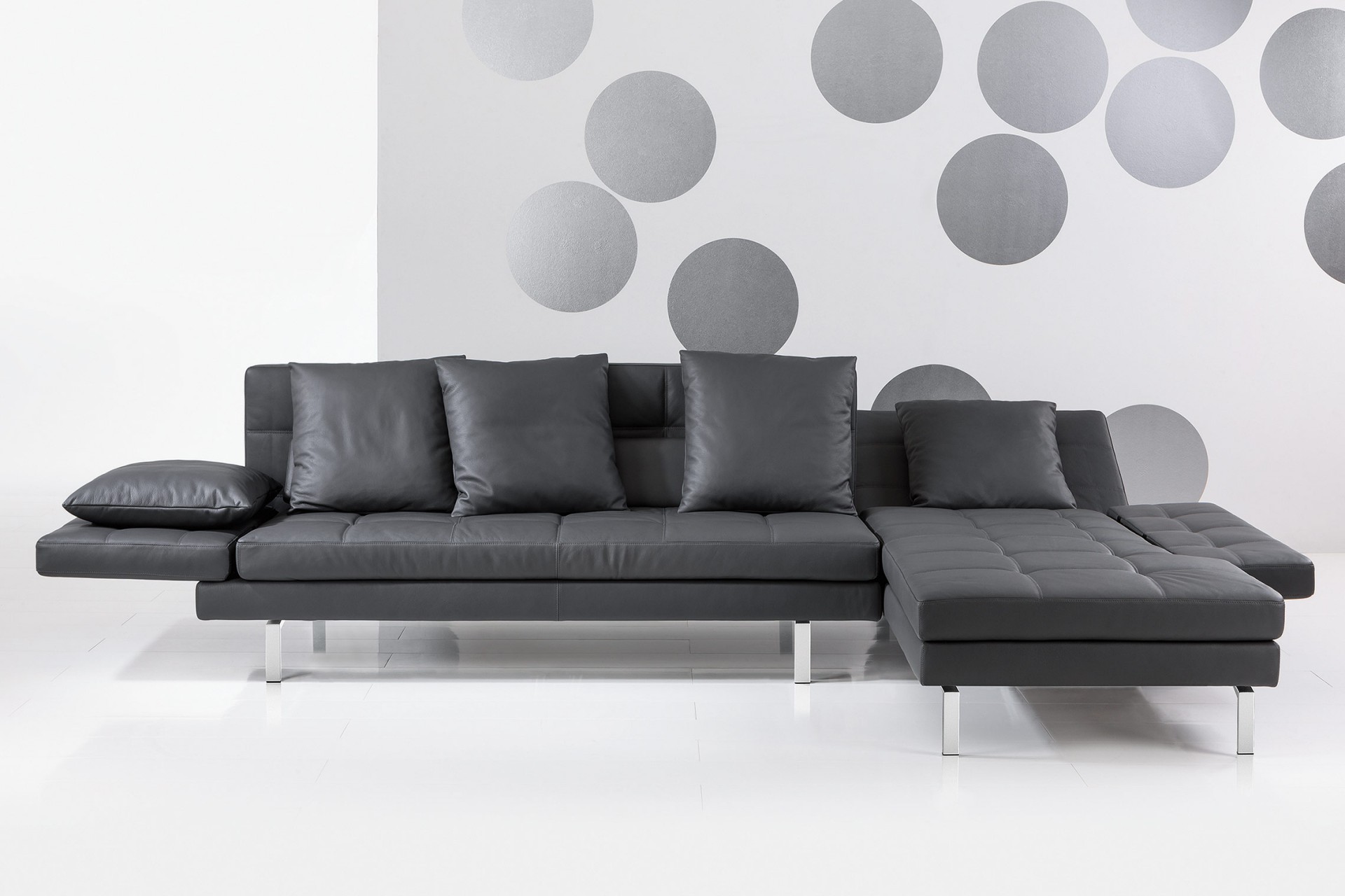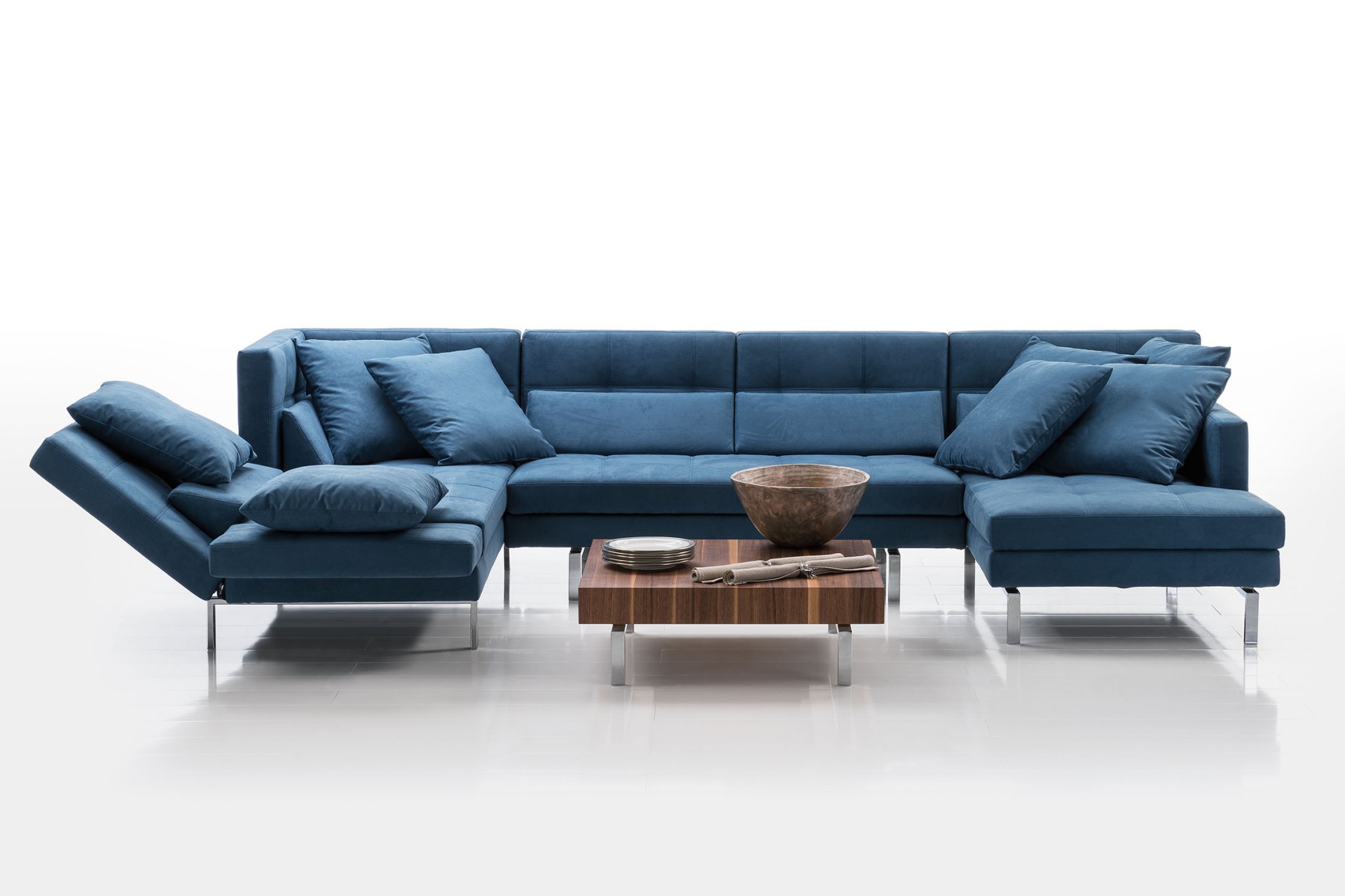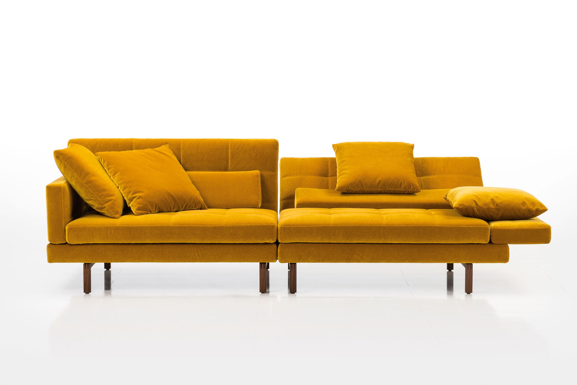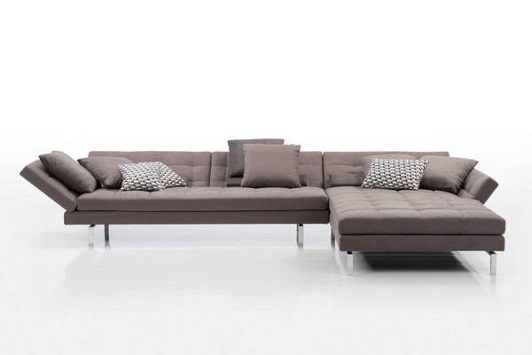 amber ist ein umfangreiches Planungsprogramm und ein vielseitig wandelbares Wohnrefugium – mit stufenlos absenkbaren Arm- und Rückenlehnen, weich gesteppter Polsteroberfläche und transparenter, geometrischer Gliederung. Hier als großzügige Eckformation aus einem Longchair in Überbreite von 120 cm und einem 2,5-sitzigen Anstellsofa mit hoher Armlehne. Longchair optional 120 oder 90 cm breit und 136 oder 161 cm lang. Die Armlehnen stehen in hoher und niedriger Ausführung zur Wahl.