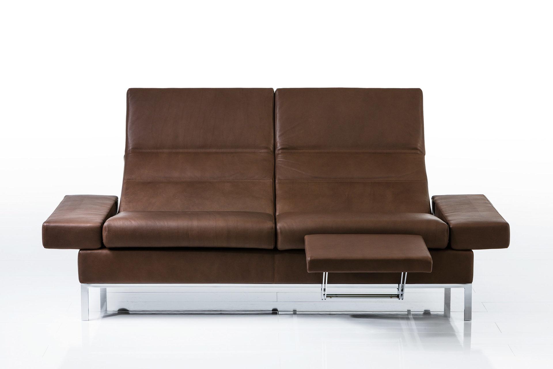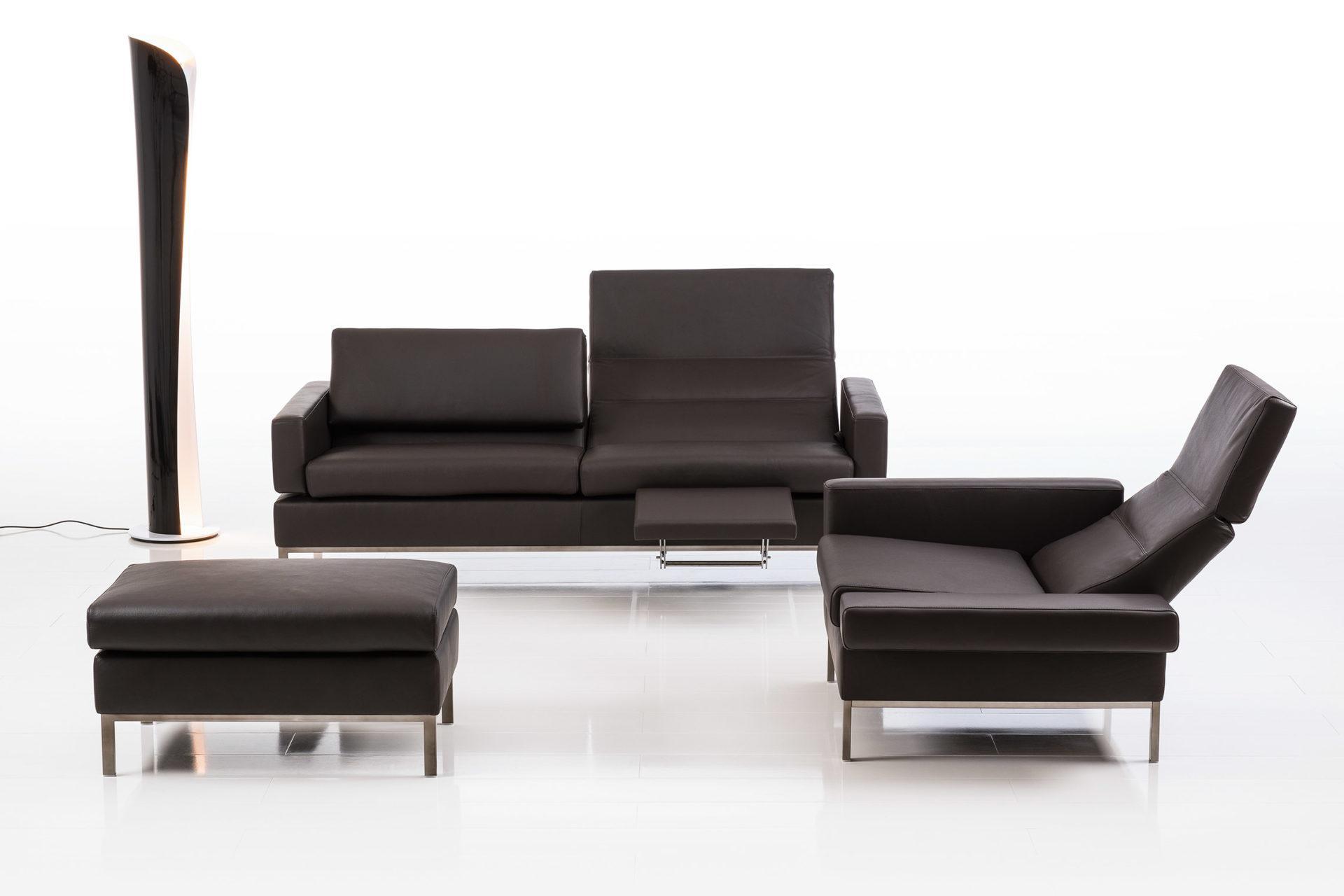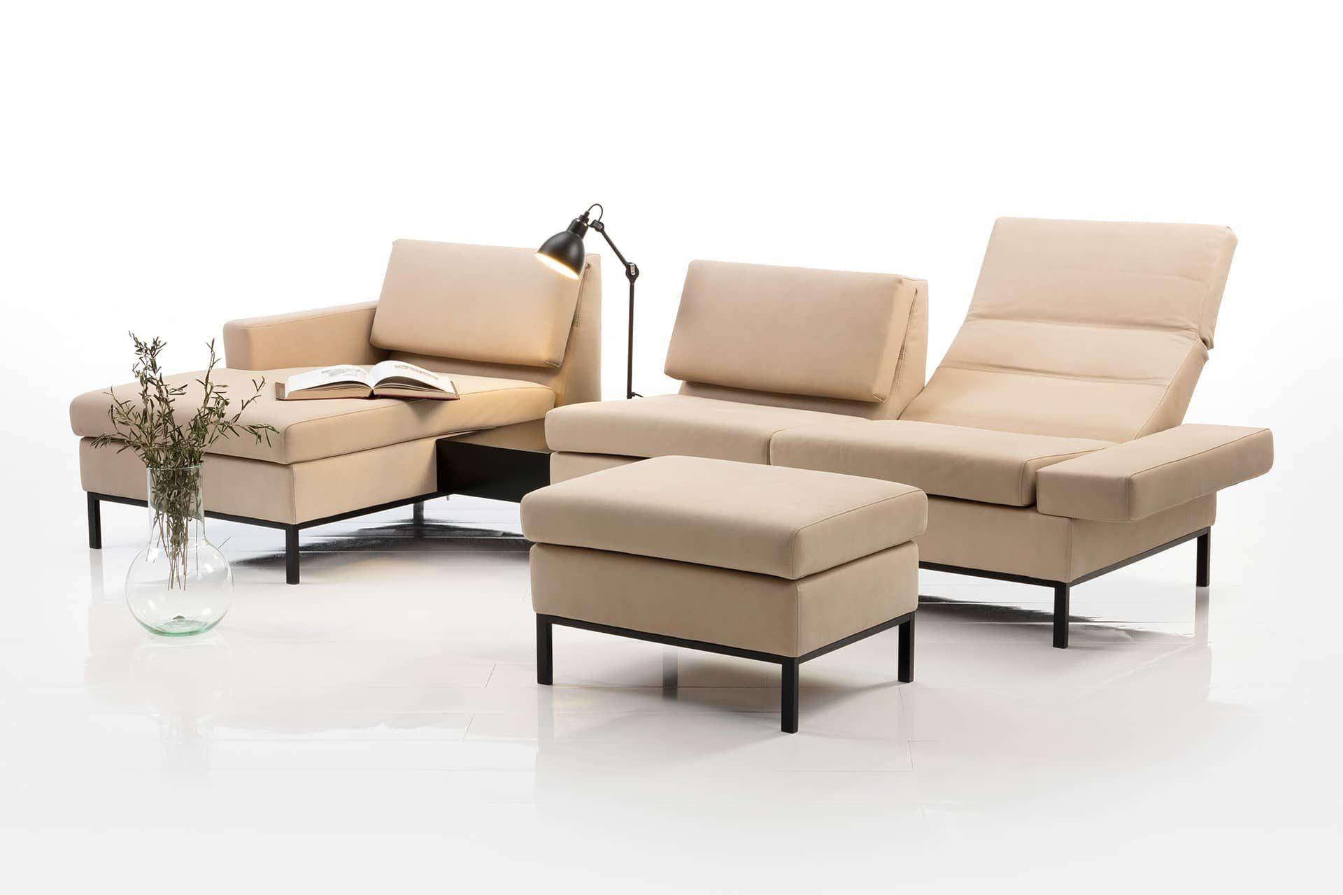 Variabler Komfort: Klappbare Armlehnen a, Rückenlehnen mit Hochlehn- und Neigefunktion sowie optional integrierte Fußstützen machen tomo superbequem. Klassisch-wohnlicher Dreisitzer in beigem Strukturstoff und mit grazilem Untergestell in Chrom matt. Durch einen passenden Hocker ergänzt.